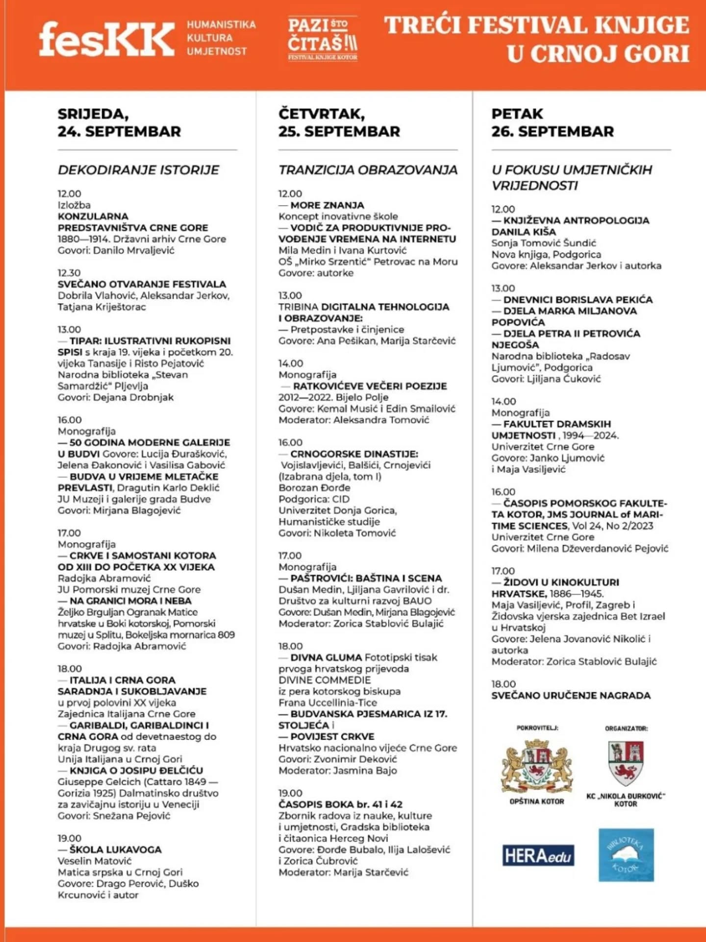 Kotor je danas postao centar knjige i kulture svečanim otvaranjem Festivala knjige FesKK – Pazi što čitaš!, koji se održava od 24. do 26. septembra u organizaciji izdavačke kuće HeraEDU i Kulturnog centra Nikola Đurković, pod pokroviteljstvom Opštine Kotor. Festival je započeo