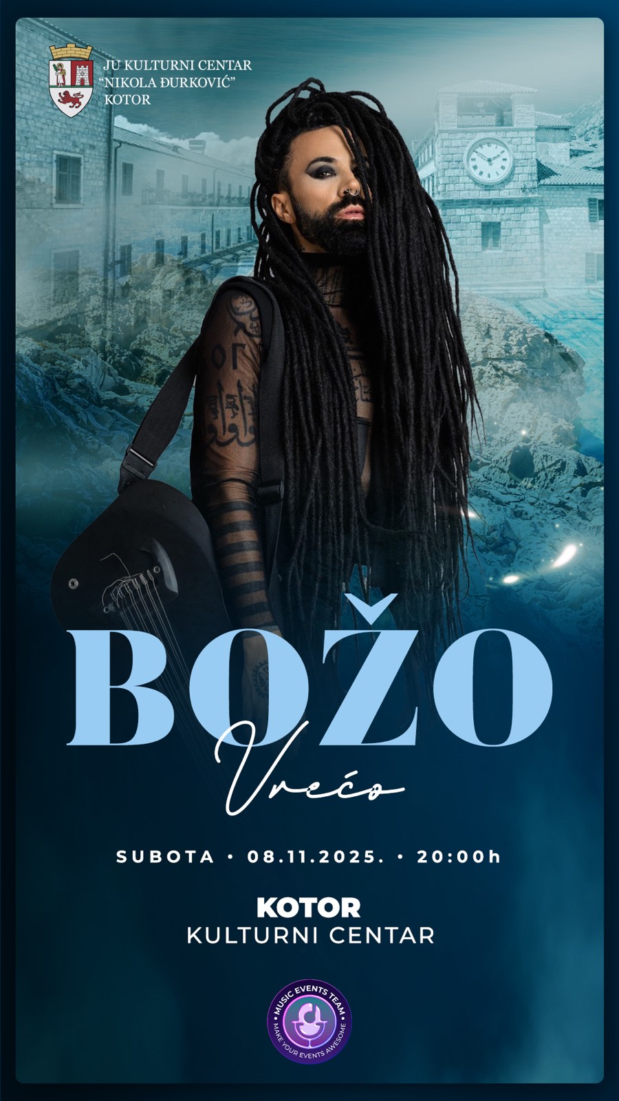 Nakon gotovo decenije, jedan od najistaknutijih izvođača sevdalinki današnjice, Božo Vrećo, ponovo dolazi pred kotorsku publiku. Koncert će biti održan 08. novembra 2025. godine u 20 sati, na Velikoj sceni Kulturnog centra “Nikola Đurković” u Kotoru. Ulaznice po cijeni od 20