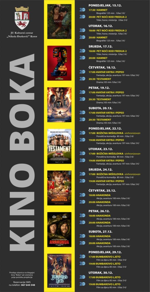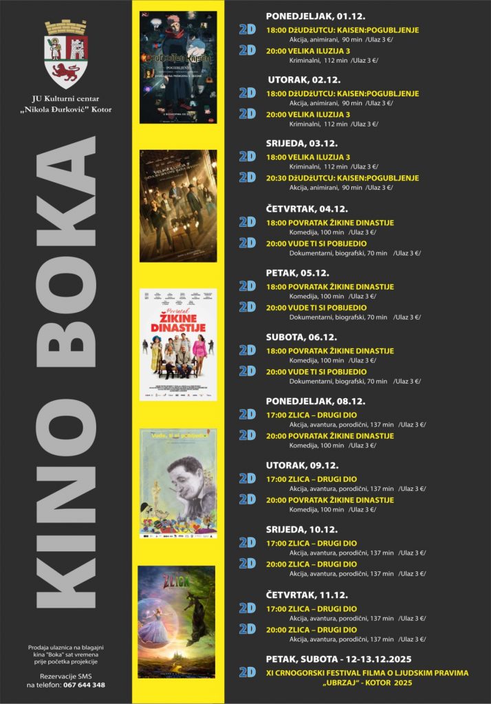 Program festivala 2025 / katalog / pdf KOTOR PRVI DAN 12. 12. 2025. (PETAK) Gimnazija Kotor – 12h00 – Si e No – Da i ne / Sanja Blečić / Crna Gora / 2025 / 52’Kino „Boka“ – 18h30 – Glas Hind Radžab / […]