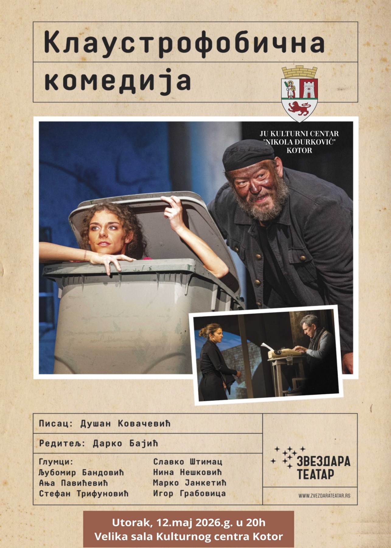 Predstava „Klaustrofobična komedija“, rađena u produkciji Zvezdara Teatra, gostuje na Velikoj sceni kotorskog Kulturnog centra u utorak 12. maja 2026. sa početkom u 20h.