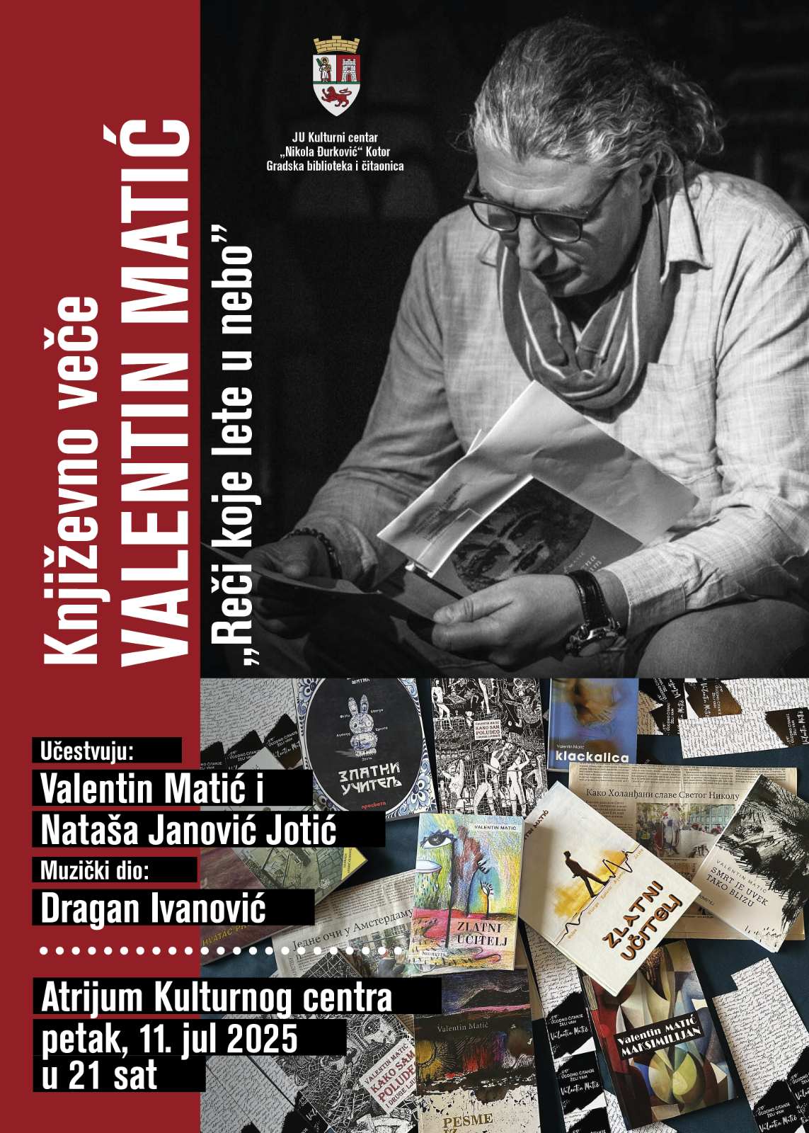 JU Kulturni centar „Nikola Đurković“/Gradska biblioteka i čitaonica Kotor u petak 11. jula organizuje književno veče „Reči koje lete u nebo“ autora Valentina Matića. Valentin Matić rođen je 15. februara 1969. godine u Beogradu. U Kotoru je završio Srednju pomorsku školu i apsolvirao na Višoj pomorskoj školi. Od novembra 1991. godine živi u Holandiji. Objavio je četiri knjige poezije: „Klackalica“ (1996); „U tuđini“ (1998); „Hvatač prošlosti“ (2016) i „Kako sam poludeo i druge ljubavi“ (2020), kao i tri romana: „Zlatni učitelj“ (2018); „Maksimilijan“ (2021) i „Smrt je uvek tako blizu“ (2022).