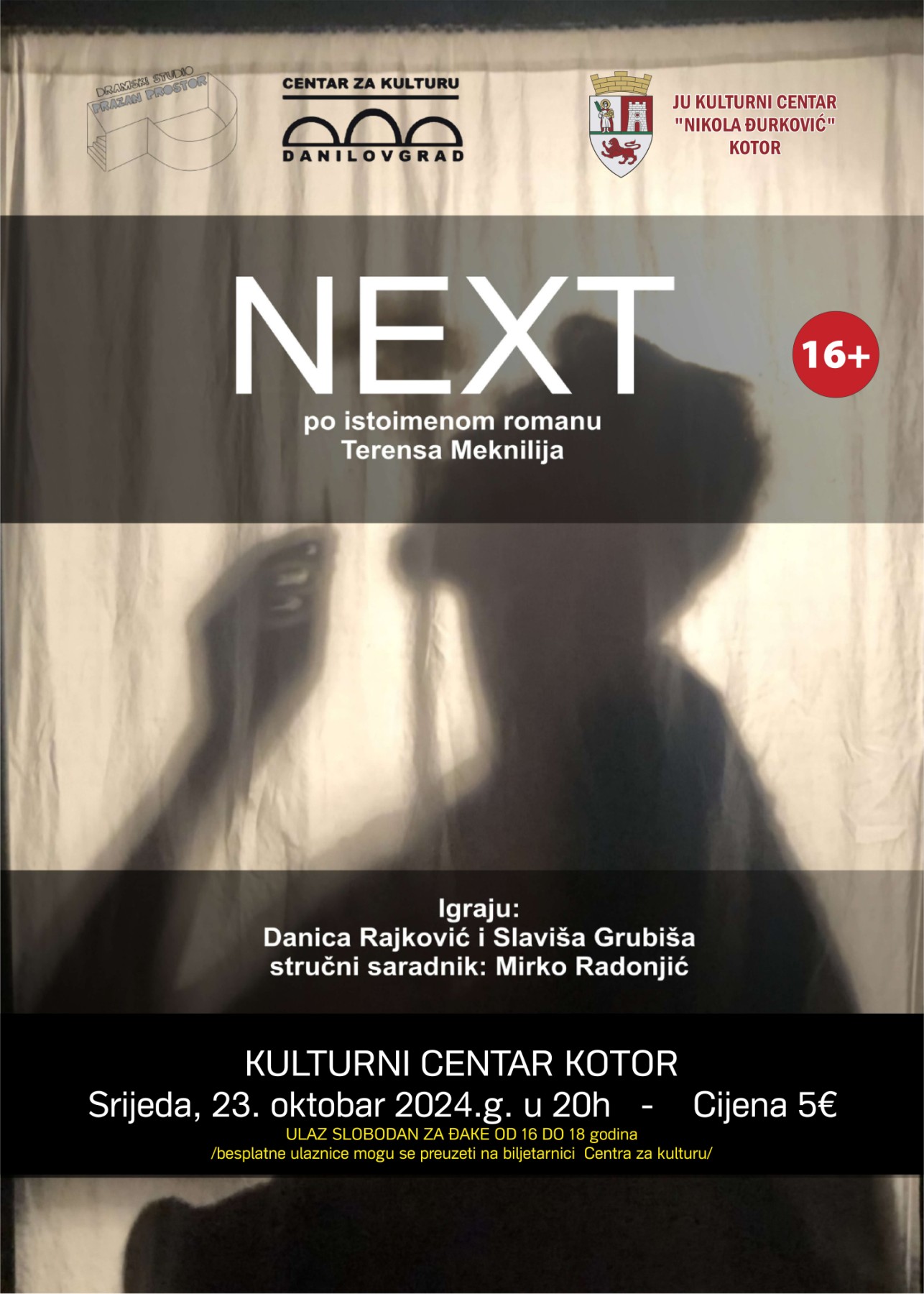 Predstva NEXT, prva profesionalna produkcja JU Centra za kulturu Danilovgrad rađena u saradnji sa Dramskim studijom Prazan prostor, gostuje u kotorskom Kulturnom centru u srijedu 23.oktobra 2024.g. od 20h.