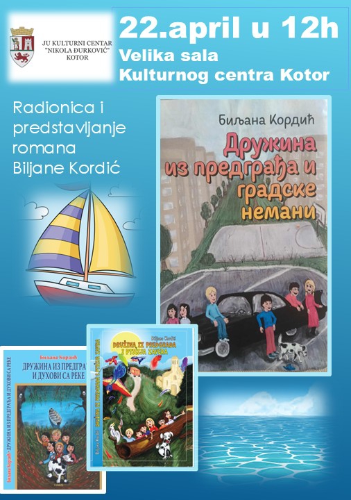Kulturni centar „Nikola Đurković“ Kotor, Gradska biblioteka i čitaonica Kotor organizuje 22. aprila sa početkom u 12 časova, u Velikoj sali Kulturnog centra „Nikola Đurković’’ radionicu i predstavljanje romana autorke Biljane Kordić povodom obilježavanja Dana planete Zemlje, koji se širom svijeta obilježava 22. aprila, sa ciljem odavanja priznanja dostignućima ekološkog pokreta i podizanja svijesti o značaju očuvanja prirodnih resursa za buduće generacije.